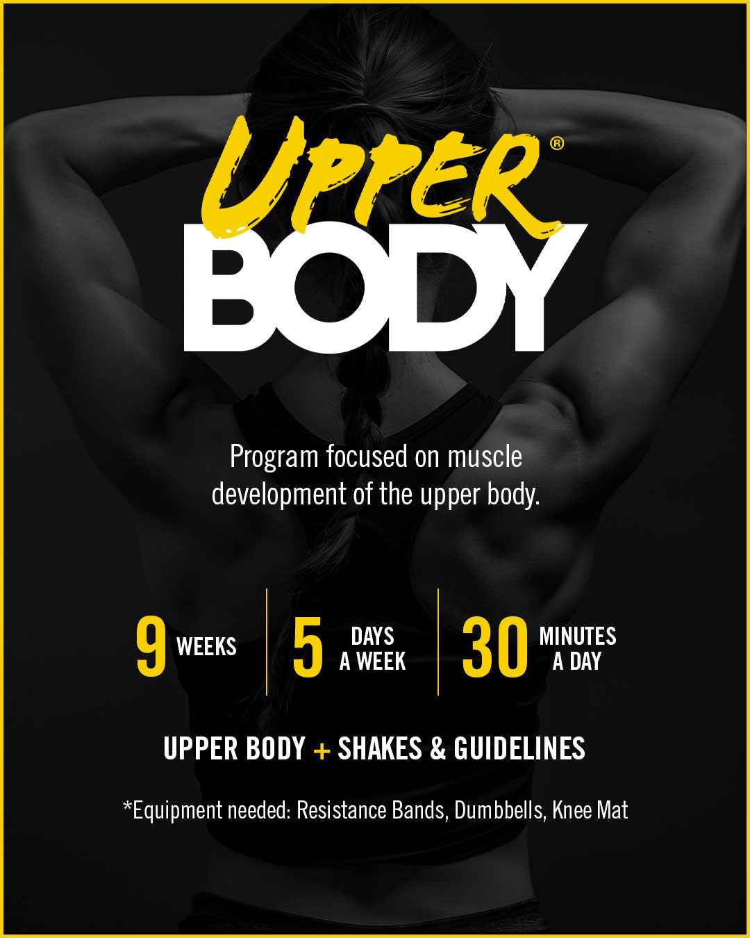 A muscle development program focused on toning your arms and back. Along with the Upper Body workouts, two days a week you will work on strengthening your abs and core.